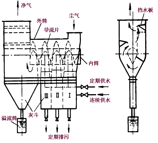 濕式除塵器的結構:不同類型的濕式除塵器其結構雖有較大差別,但總體上一般由塵氣導入裝置,引水裝置,水氣接觸本體,液滴分離器和污水(泥)排放裝置組成。